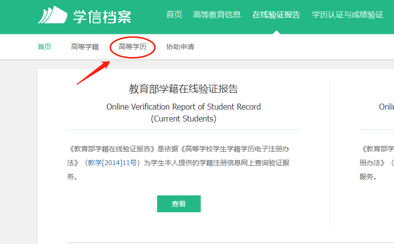 登录账号,选择“在线验证报告”——“高等学历”点击查看